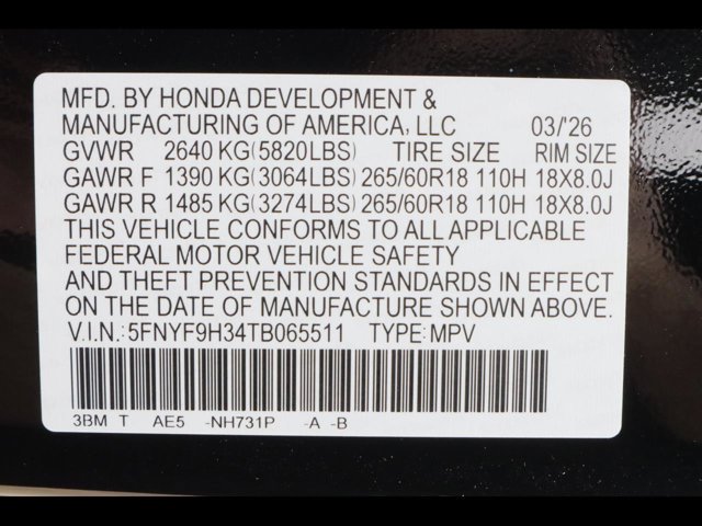 - VIN : 5FNYF9H34TB065511