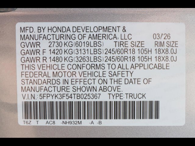 - VIN : 5FPYK3F54TB025367