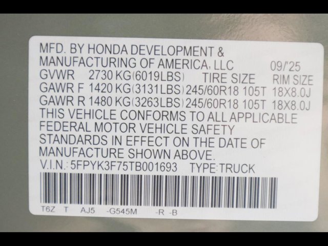 - VIN : 5FPYK3F75TB001693